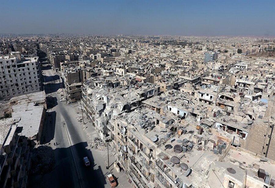 Anadolu Ajansı ekiplerinin insansız hava aracı (İHA) ile çektiği görüntüler, Özgür Suriye Ordusu'nun Halep'e girdiği 22 Temmuz 2012'den bu yana ağır saldırı altında olan kentin Tarık el-Bab semtindeki yıkımı gözler önüne serdi.
