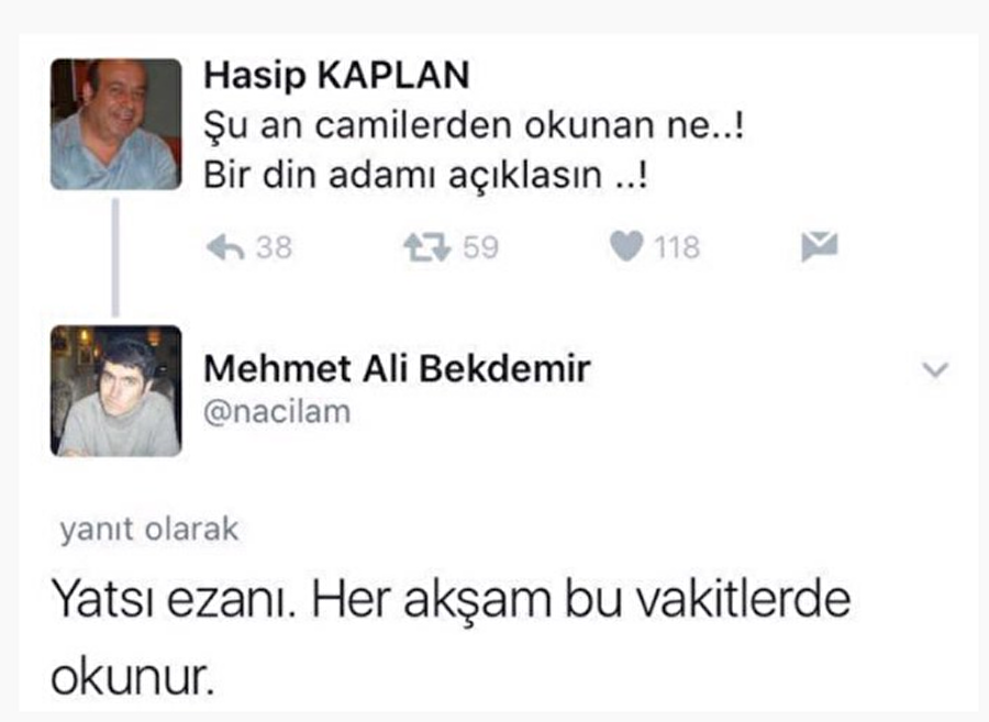 Oysa ki Kaplan'ın sorduğu her gece aynı saatlerde okunan yatsı ezanıydı. Bir twitter kullanıcısı da, Hasip Kaplan'a cevabı anında verdi.