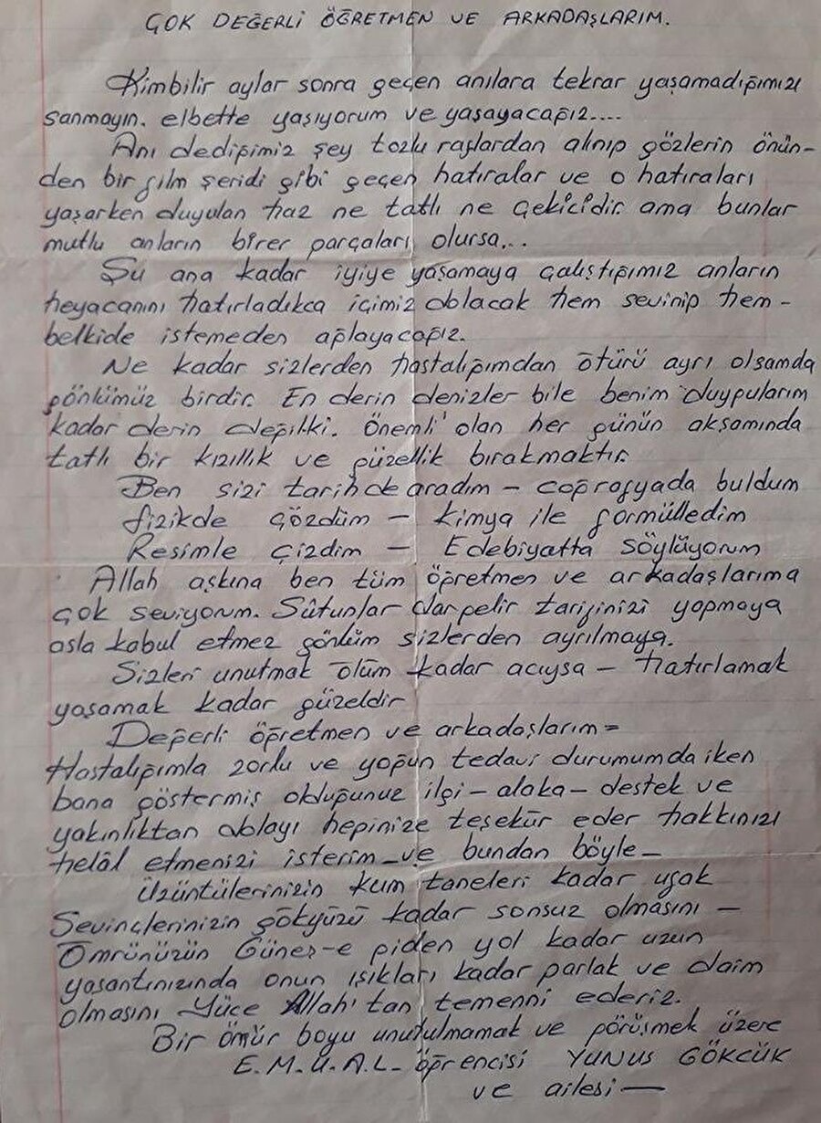 3 yıl önce amansız bir hastalığa yakalandıktan sonra hayata gözlerini yuman Yunus Gökcük’ün ölmeden önce yazdığı mektup, 2 yıl sonra ortaya çıktı. Yunus’un yazdığı mektup herkesi duygulandırdı.