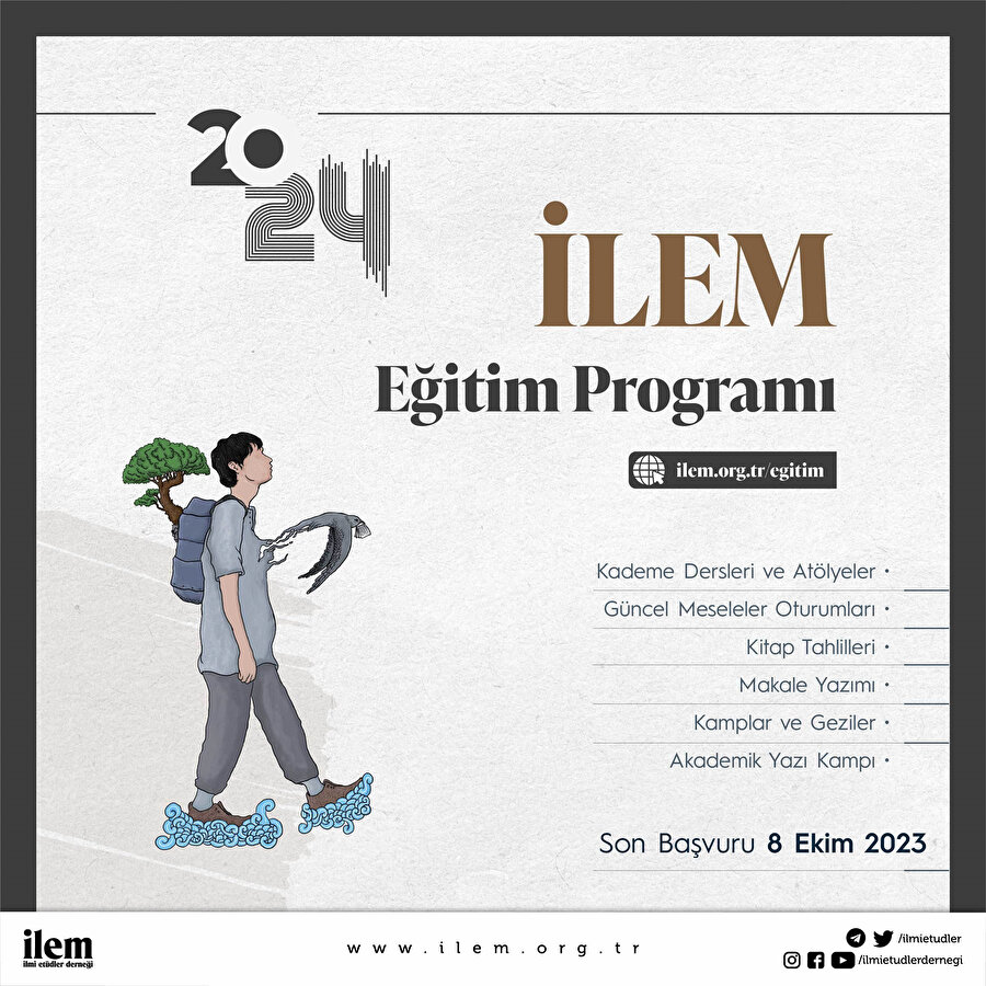İLEM’in 2002 yılından beri aralıksız olarak sürdürdüğü İLEM Eğitim Programı’nda 2023-2024 dönemi başvuruları başladı. Geleneğin birikimini tanımak ve çağdaş dünyayı anlamak isteyen, günümüzün problem alanlarına yönelik eleştirel bir yaklaşım sunabilecek öğrencileri bünyesine katmayı hedefleyen iki yıllık programda kademe dersleri, atölyeler, kitap tahlillerinin yanı sıra geziler ve kamplar yer alacak.