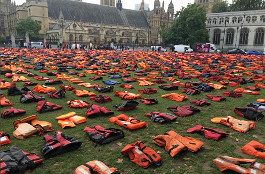Uluslararası yardım ve insan hakları kuruluşları tarafından İngiliz Parlamentosu önündeki meydana Avrupa'daki sığınmacı krizine dikkati çekmek için 2 bin 500 can yeleği konuldu.