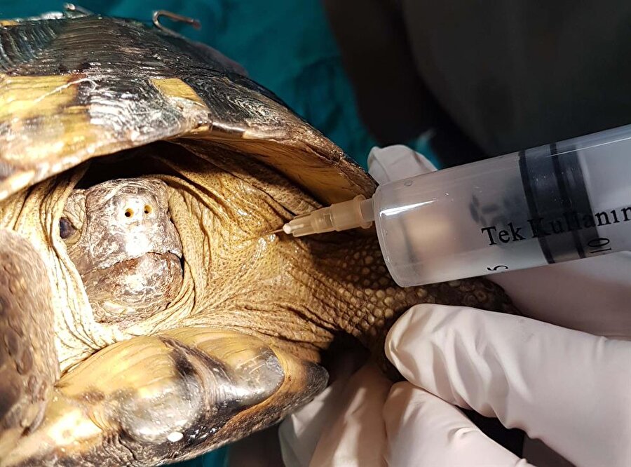 Samsun'da aracın altında kalarak kabuğu kırılan yaralı kaplumbağa, Samsun Büyükşehir Belediyesi Yaban Hayvanları İlk Yardım Ünitesi'ne getirilerek tedavi altına alındı.