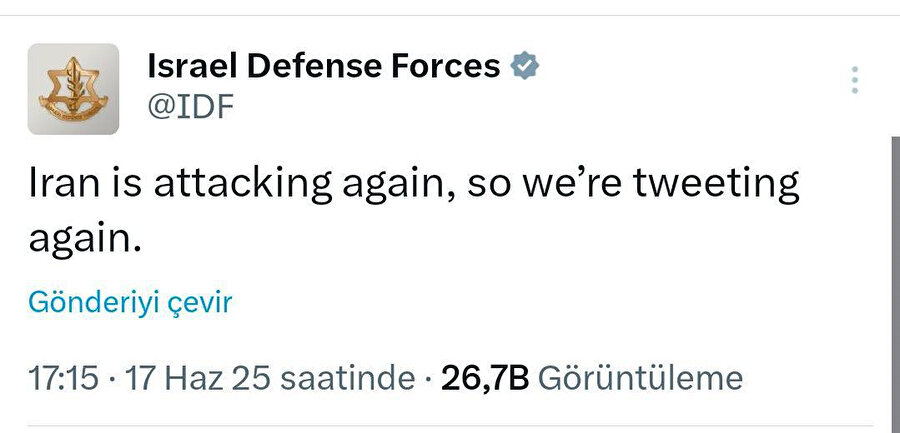 Ordunun resmi hesabından yapılan paylaşımda, “İran yeniden saldırıyor, bu yüzden biz de yeniden tweet atıyoruz” ifadelerine yer verildi.