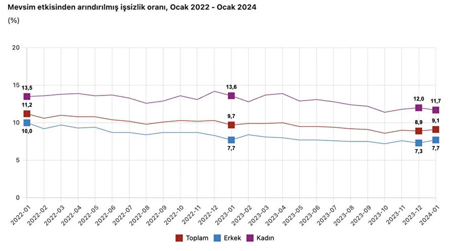 Türkiye'de en son açıklanan işsizlik oranı Aralık 2023'te, bir önceki aya göre 0,1 puan azalarak yüzde 8,8 olmuştu.