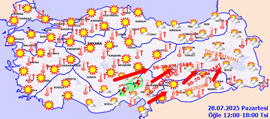 Rüzgar: Genellikle güney yönlerden hafif, ara sıra orta kuvvette, Doğu Akdeniz, İç Anadolu'nun güneydoğusu, Doğu Anadolu’nun güneybatısı ve Güneydoğu Anadolu’da güney ve güneybatı yönlerden kuvvetli ve kısa süreli fırtına (50-70 km/saat) şeklinde esmesi bekleniyor.