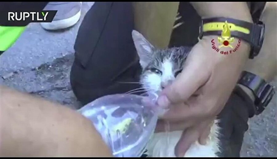 Ülkede arama kurtarma çalışmaları devam ederken, bir kedi enkazın altından 6 gün sonra kurtarıldı. Kurtarma ekipleri, enkazdan çıkardıkları kediye ilk olarak su verdi.