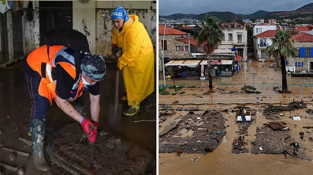 Bölgedeki belediye ekipleri, gönüllüler ve iş makineleri yardımıyla yolları kapatan taş, moloz ve ağaç parçalarını temizliyor. Evlerine su dolan vatandaşlar, AFAD ve belediye ekipleriyle birlikte çamur temizliği yapıyor.