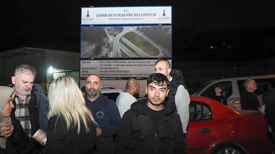 Hasar nedeniyle evlerine girmekte tedirginlik yaşayan mahalle sakinleri, Buca ilçesinin Ufuk ile Bornova ilçesinin Çamkule mahalleleri arasında yer alan tünelin Çamkule şantiyesinde toplandı.