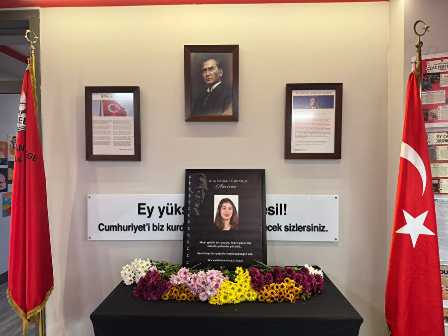 Türkmen'in arkadaşları, okulun girişine konulan fotoğrafın bulunduğu yere karanfil bıraktı.