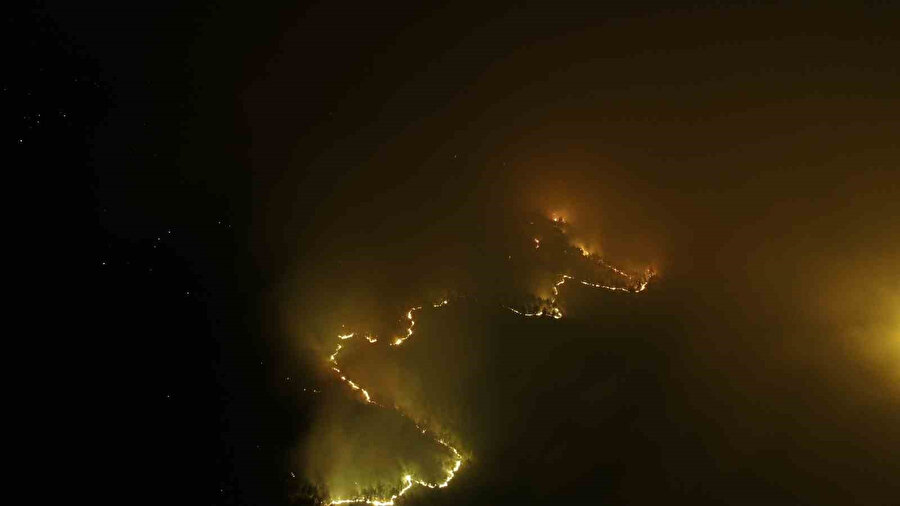 Ekipler, alevleri kontrol altına almak için yoğun çaba harcıyor. Yangın bölgesinde alevlerin etkilediği alanlar dronla havadan görüntülendi.