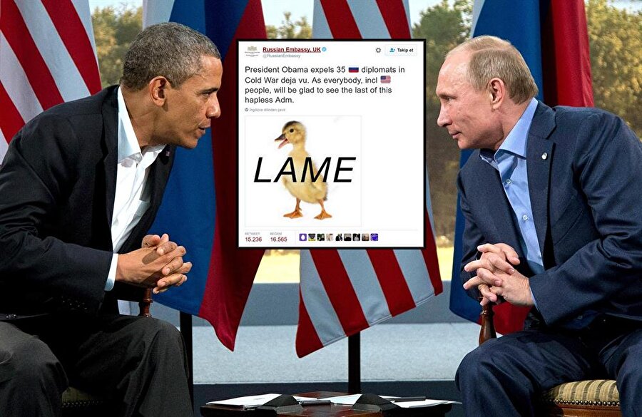 Rusya'nın Londra Büyükelçiliği resmi Twitter hesabından üzerinde 'lame' (topal) yazan bir ördek resmi paylaştı. Paylaşımın içeriğinde ise “ABD Başkanı (Barack) Obama, soğuk savaş dejavusu içinde 35 Rus diplomatı sınırdışı etti. Herkes, ABD vatandaşları da dahil, bu talihsiz yönetimin sona erdiğini görünce memnun olacak" diye yazdı.