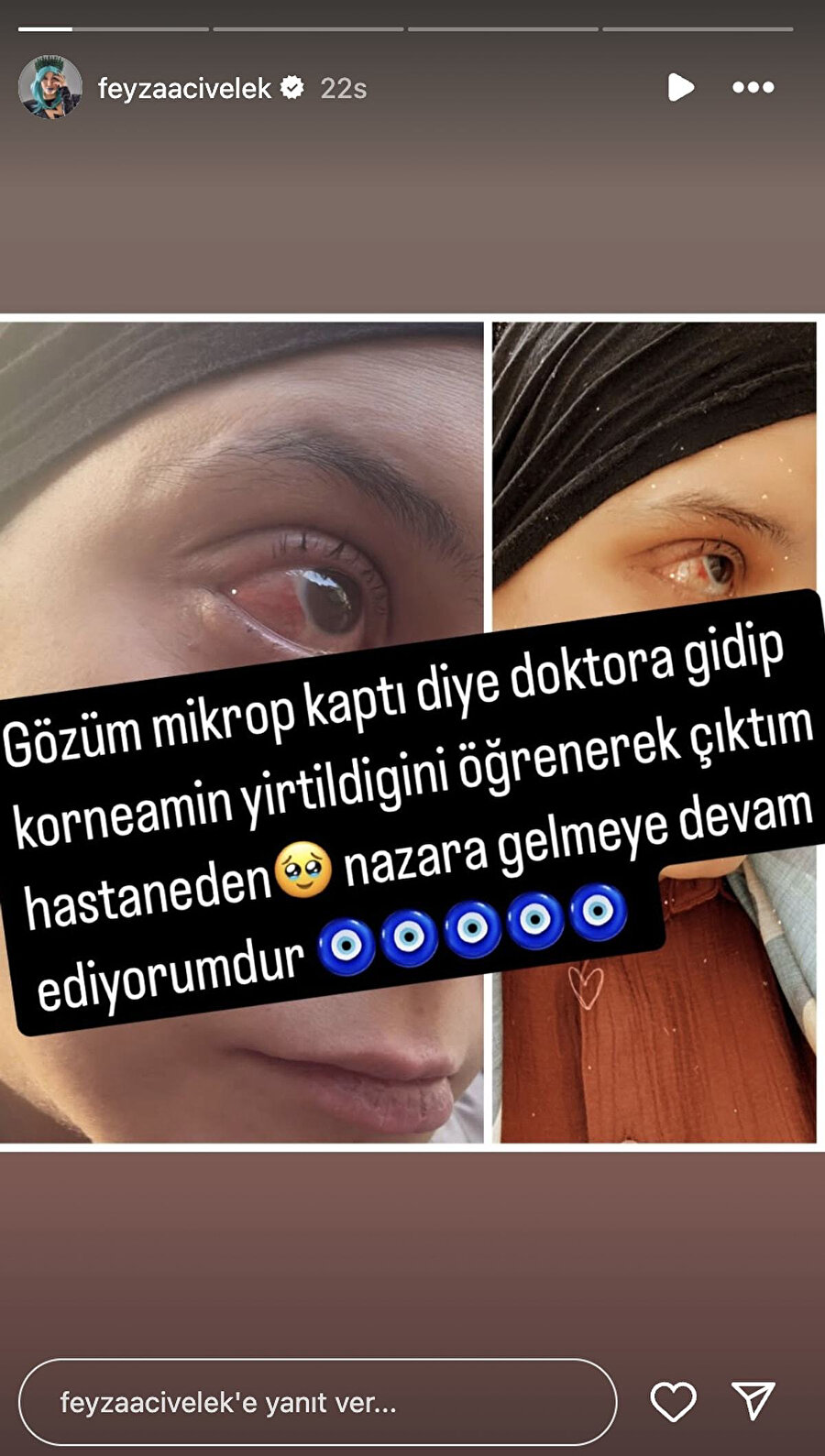 Civelek, Instagram hesabından yaptığı açıklamada gözünde enfeksiyon şüphesiyle hastaneye gittiğini, ancak yapılan kontrollerde korneasının yırtıldığını öğrendiğini duyurdu. Gözünün son halini de paylaşan oyuncu, yaşadığı bu sağlık sorununu “Nazara gelmeye devam ediyorumdur…” sözleriyle takipçilerine aktardı.