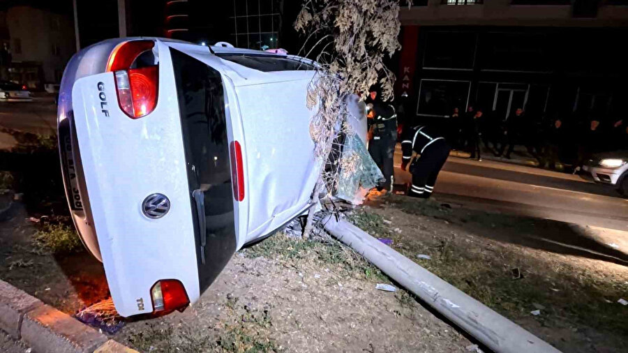 Feci kazada kontrolden çıkan otomobil, direği ve ağacı devirdi: İki kişi yaralandı