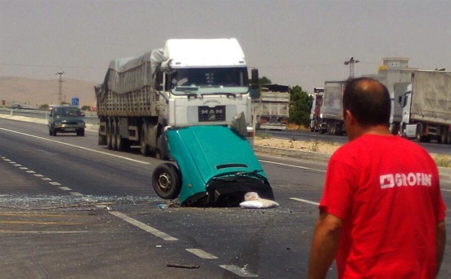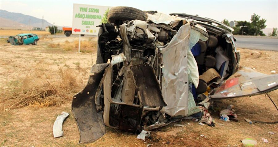 Çarpışmanın şiddetiyle ikiye ayrılan otomobilin ön kısmı yol ortasında kalırken, kontrolden çıkan hafif ticari araç ise devrildi.