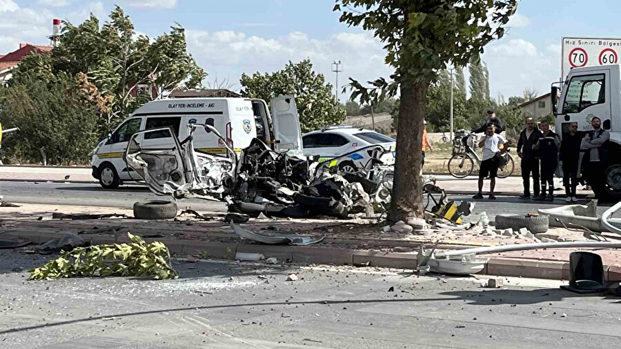 Çarpışmanın etkisiyle Mevlüt Külcü idaresindeki otomobil önce direğe sonra ağaca çarparak ikiye bölünüp hurdaya döndü.