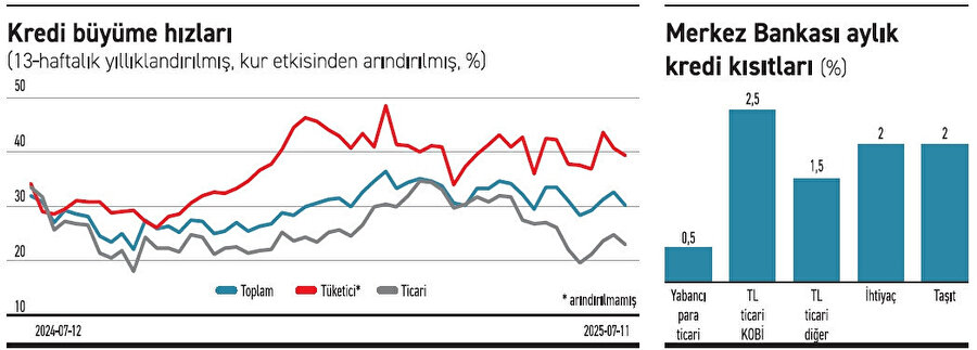 Merkez Bankası TL cinsi kredilere yönelik makroihtiyati tedbirleri en son ocak ayında sıkılaştırdı. Buna göre TL ticari kredilerde aylık yüzde 2 olan büyüme sınırı farklılaştırıldı, KOBİ kredileri için aylık büyüme sınırı yüzde 2,5, diğer ticari krediler için yüzde 1,5 olarak belirlendi. Yabancı para ticari kredilerde ise mart ayında aylık yüzde 1 olan büyüme sınırı yüzde 0,5’e çekildi. İhtiyaç kredilerinde ise geçen yıl marttan bu yana aylık yüzde 2 büyüme sınırı uygulanmaya devam ediyor. Merkez Bankası bu kısıtların etkisiyle kredi büyümelerinin dezenflasyon patikasıyla uyumlu şekilde devam edeceğini enflasyon raporunda da belirtti. Uzmanlar aslında Merkez Bankası’nın bir süredir kredi kısıtlarını gevşetme yönünde sinyal verdiğini ancak haziran PPK toplantısı döneminde oldukça sıcak olan jeopolitik gelişmelerin bu adımı ötelediğini vurguladı.