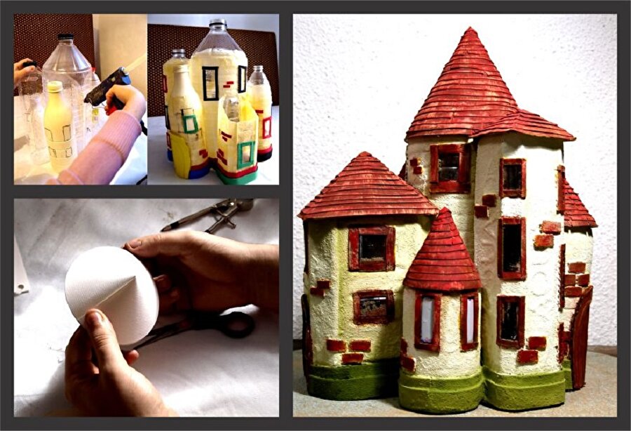 Evdeki kullanılmış şişeleri çöpe mi atıyorsunuz? Durun atmayın. O şişeleri kullanarak odanıza koyabileceğiniz harika bir ev yapabilirsiniz. Nasıl mı? Aşağıda göreceğiniz adımları uygulayarak 7,5,2 ve 1 litrelik şişeler kullanarak odanız için bir şato yapabilirsiniz.