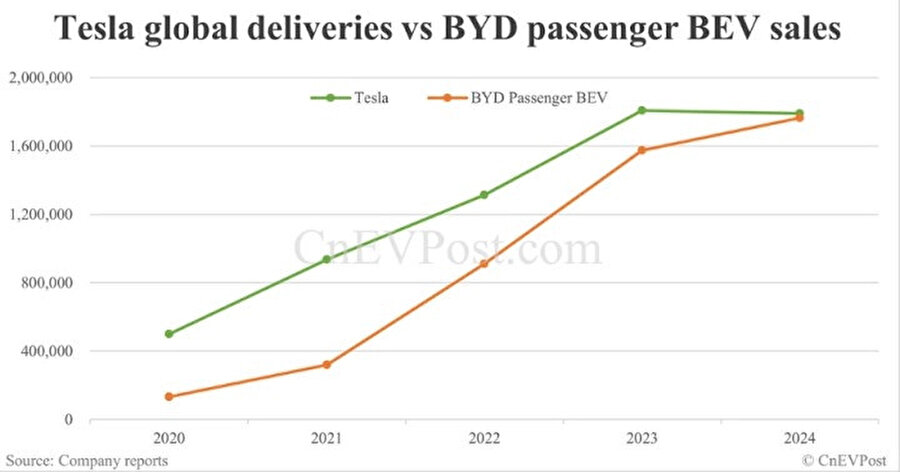 Tesla ile BYD arasındaki liderlik yarışı kızışıyor. 2024’te Tesla, bataryalı elektrikli araç (BEV) satışlarında 1,78 milyon adetle zirveyi korumayı başardı, ancak Çinli üretici BYD sadece yüzde 1,35’lik bir farkla hemen arkasından geldi. Yıl genelinde Tesla önde kalsa da, BYD’nin son iki çeyrektir Tesla’dan daha fazla araç sattığı dikkat çekiyor.