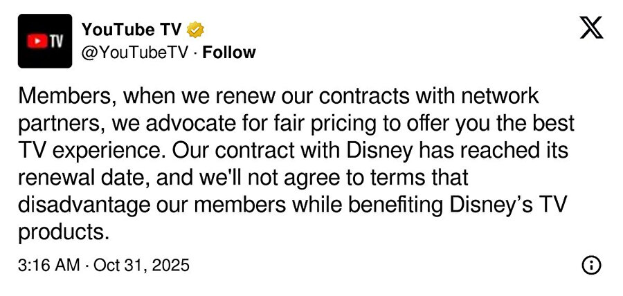 Disney’in sahip olduğu ESPN, ABC, FX, National Geographic, Disney Channel ve ABC News Live gibi kanallar, sözleşmenin süresi dolmadan platformdan kaldırıldı. YouTube TV, resmi açıklamasını dün gece sosyal medya üzerinden yaptı. Şirket, “Disney ile olan sözleşmemizin yenilenme zamanı geldi. Ancak üyelerimizi dezavantajlı duruma düşürecek ve Disney’in TV ürünlerine avantaj sağlayacak koşulları kabul etmeyeceğiz” ifadelerini kullandı.