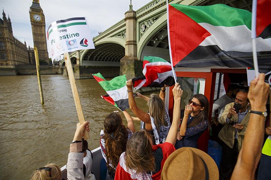 İngiltere'nin başkenti Londra'da, bazı Filistinli sivil toplum örgütleri ile İngiliz aktivistler, Gazze'ye destek için yola çıkan “Özgürlük filosu”na destek eylemi gerçekleştirdi.