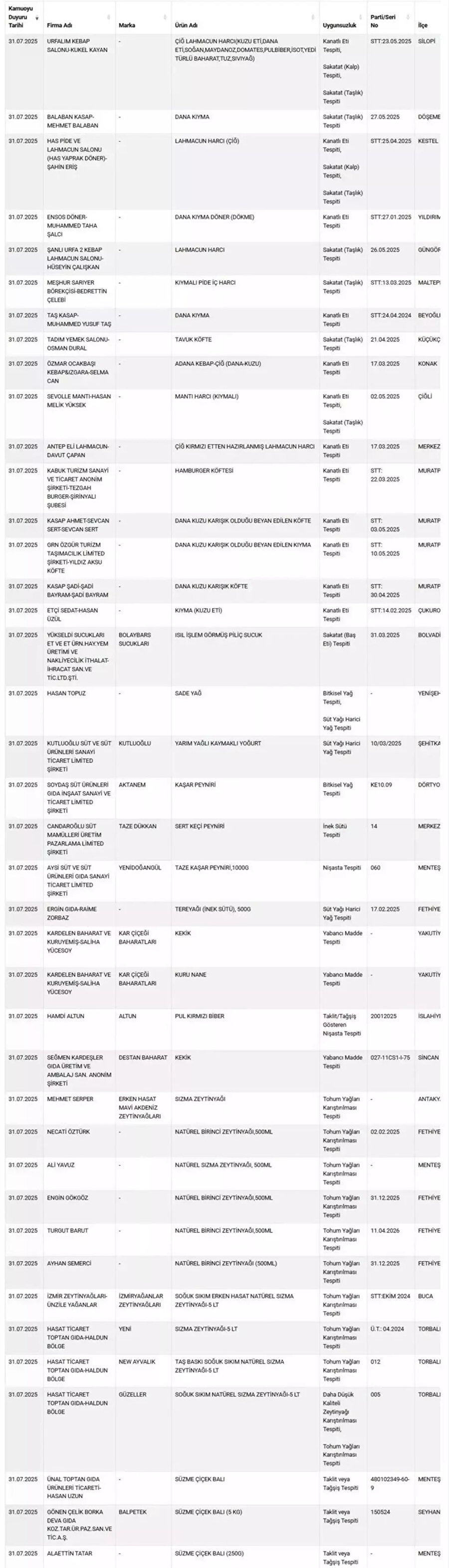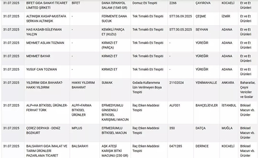 Listede mide bulandıran bir başka detay ise at ve eşek eti skandalı. Denetimlerde, Adana’dan 4, İzmir’den ise 1 firmanın ürünlerinde at ve eşek eti kullandığı tespit edildi. Daha önce de gündeme gelen bu tür vakalar, et ürünlerinin izlenebilirliği ve denetimi konusundaki zafiyetleri bir kez daha gündeme taşıdı.
