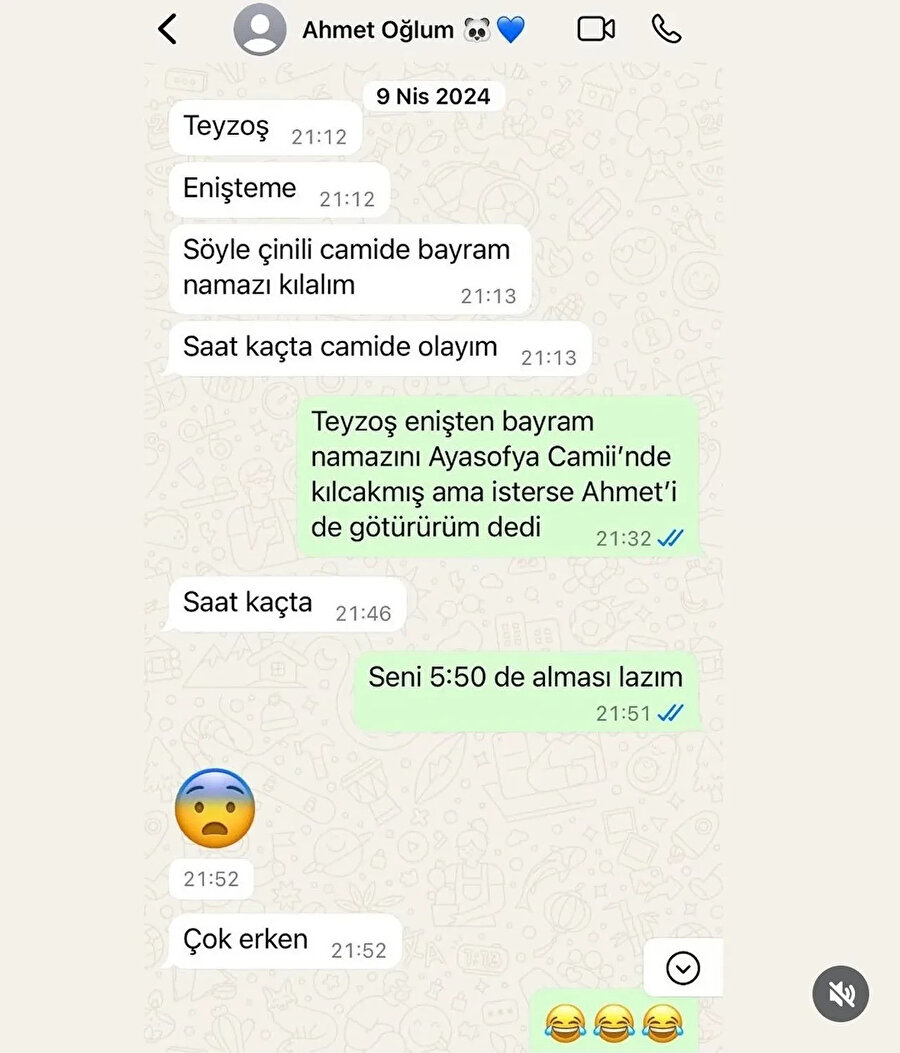 Ahmet Minguzzi, 6 Nisan 2024’te, yani Ramazan Bayramı’nda "Teyzoş, enişteme söyle bayram namazını Çinili Cami’de kılalım" diye yazmıştı.