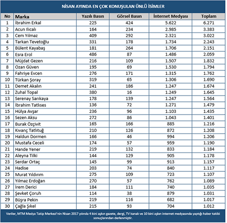 Medya Takip Merkezi tarafından hazırlanan rapora göre Nisan ayında magazin ve sanat dünyasında en fazla fazla haber olan isimler belli oldu.