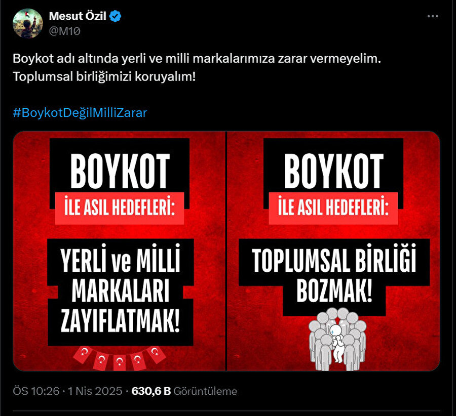 Alman Milli Takımı'nın eski futbolcusu Mesut Özil, bazı kişi ve kuruluşların, sosyal medya mecralarından "2 Nisan'da ticareti durduralım" şeklindeki boykot çağrılarının ardından sosyal medya hesabından açıklama yaptı