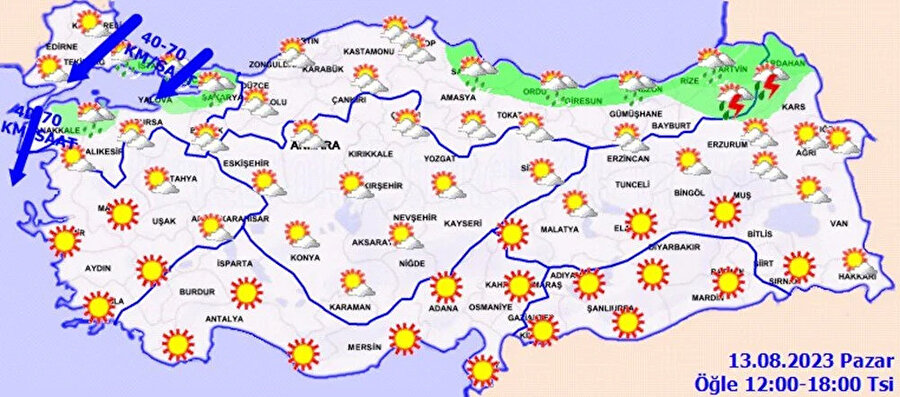 Rüzgar: Batı kesimlerde kuzey, doğu kesimlerde güney yönlerden hafif, ara sıra orta kuvvette, Marmara'nın batısında kuzey ve kuzeydoğu yönlerden kuvvetli ve kısa süreli fırtına (40-60 km/saat, hamlesi 75 km/saat) şeklinde eseceği tahmin ediliyor.
