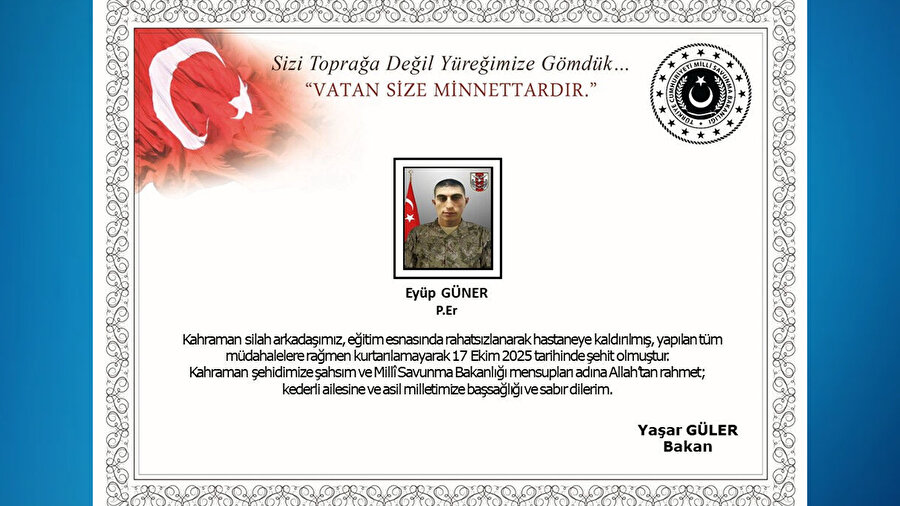- Milli Savunma Bakanlığı (MSB) sosyal medya hesabından yapılan paylaşımda, “Tokat’ta görev yapmakta olan kahraman silah arkadaşımız Piyade Er Eyüp Güner, eğitim esnasında rahatsızlanarak hastaneye kaldırılmış, yapılan tüm müdahalelere rağmen kurtarılamayarak 17 Ekim 2025 tarihinde şehit olmuştur. Bizleri derin bir acı ve üzüntüye boğan bu olayda hayatını kaybeden aziz şehidimize Allah’tan rahmet, kederli ailesine, Türk Silahlı Kuvvetleri ile asil milletimize başsağlığı ve sabır dileriz” ifadeleri kullanıldı