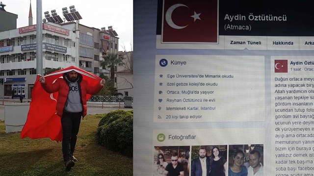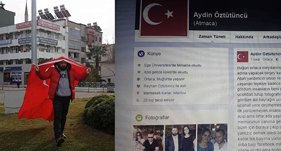 Muğla'nın Ortaca İlçesi'nde yaşayan mimar 34 yaşındaki Aydın Öztütüncü, İstanbul ve Kayseri'de yaşanan terör saldırısına ve Halep'teki vahşete tepki göstermek amacıyla, en işlek caddelerin kesiştiği dönel kavşakta dev Türk Bayrağı ile 6 saatlik sessiz eylem yaptı.