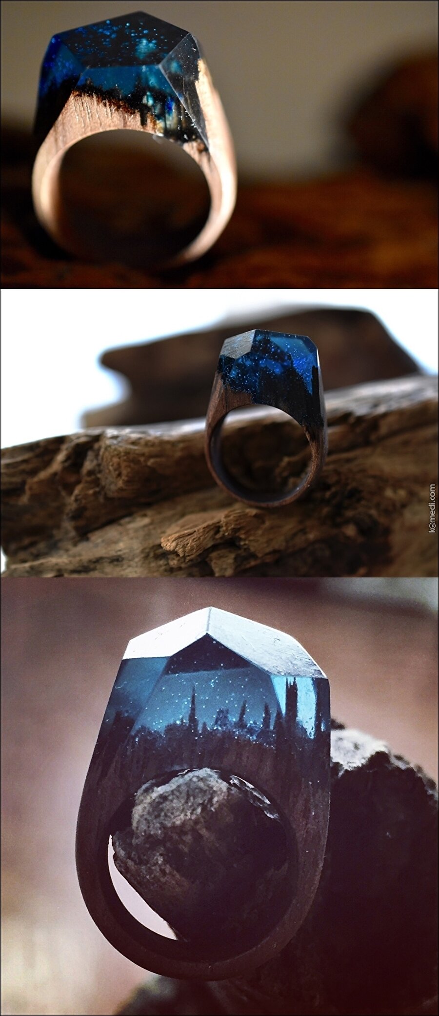 Kanadalı bir firma tarafından üretilen bu tahta yüzükler elmas ve pırlantadan daha fazla ilgi görüyor. Gece karanlıkta parlayan modellerinin yanı sıra, yüzüklerin üzerindeki gizemli dünya herkesi büyülüyor. Yüzükler tahta; ancak fiyatları küçük bir pırlanta yüzük kadar.