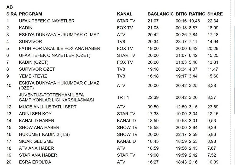 İşte reyting sonuçları