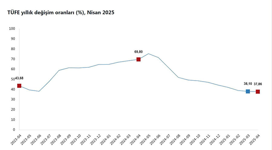 TÜİK, Nisan 2025 dönemine ilişkin enflasyon verilerini açıkladı. Buna göre; tüketici fiyatları bir önceki aya göre yüzde 3, bir önceki yılın aralık ayına göre yüzde 13,36, bir önceki yılın aynı ayına göre yüzde 37,86 ve 12 aylık ortalamalara göre yüzde 48,73 arttı.