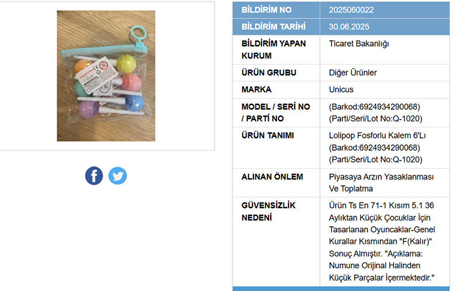 Ticaret Bakanlığı, küçük çocuklar için tehlike arz eden “Unicus” marka lolipop fosforlu kalem setinin piyasadan toplatılmasına karar verdi. Ürün, küçük parça içermesi nedeniyle çocuk sağlığı açısından riskli bulundu.