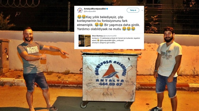 Gençler bu kareyi sosyal paylaşım sitesi üzerinden, "Konteyneri 15 dakikalığına böyle bir hizmet için kullandık, teşekkür ederiz. Konteyneri aldığımız gibi bıraktık" mesajı ile belediyenin sayfasına gönderdi. CHP’li Muratpaşa Belediyesinden gençlerin mesajına, "Kaç yıllık belediyeyiz, çöp konteynerinin bu fonksiyonunu hiç fark etmemiştik. Bir yaşımıza daha girdik. Yardımcı olabildiysek ne mutlu" yanıtı verildi.