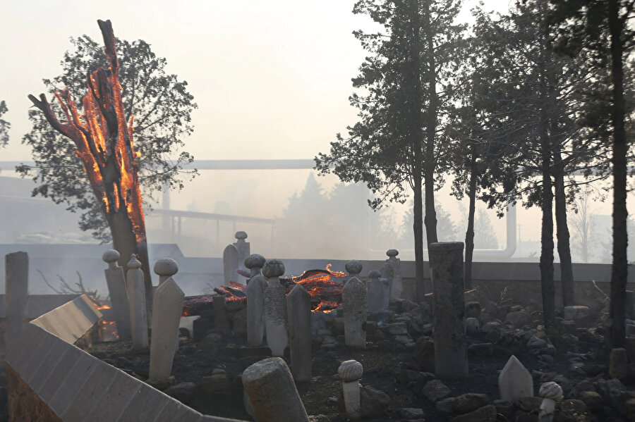 Çanakkale Ayvacık'ta 659 yıllık Murad Hüdavendigar Camii bahçesindeki mezarlar da alevlerden zarar gördü.