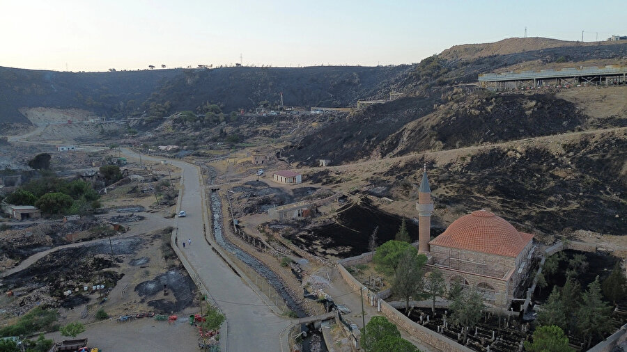 Yangından etkilenen ve içinde jeotermal santral ile tarihi Hüdavendigar Cami'nin bulunduğu Tuzla köyü dron ile havadan görüntülendi.