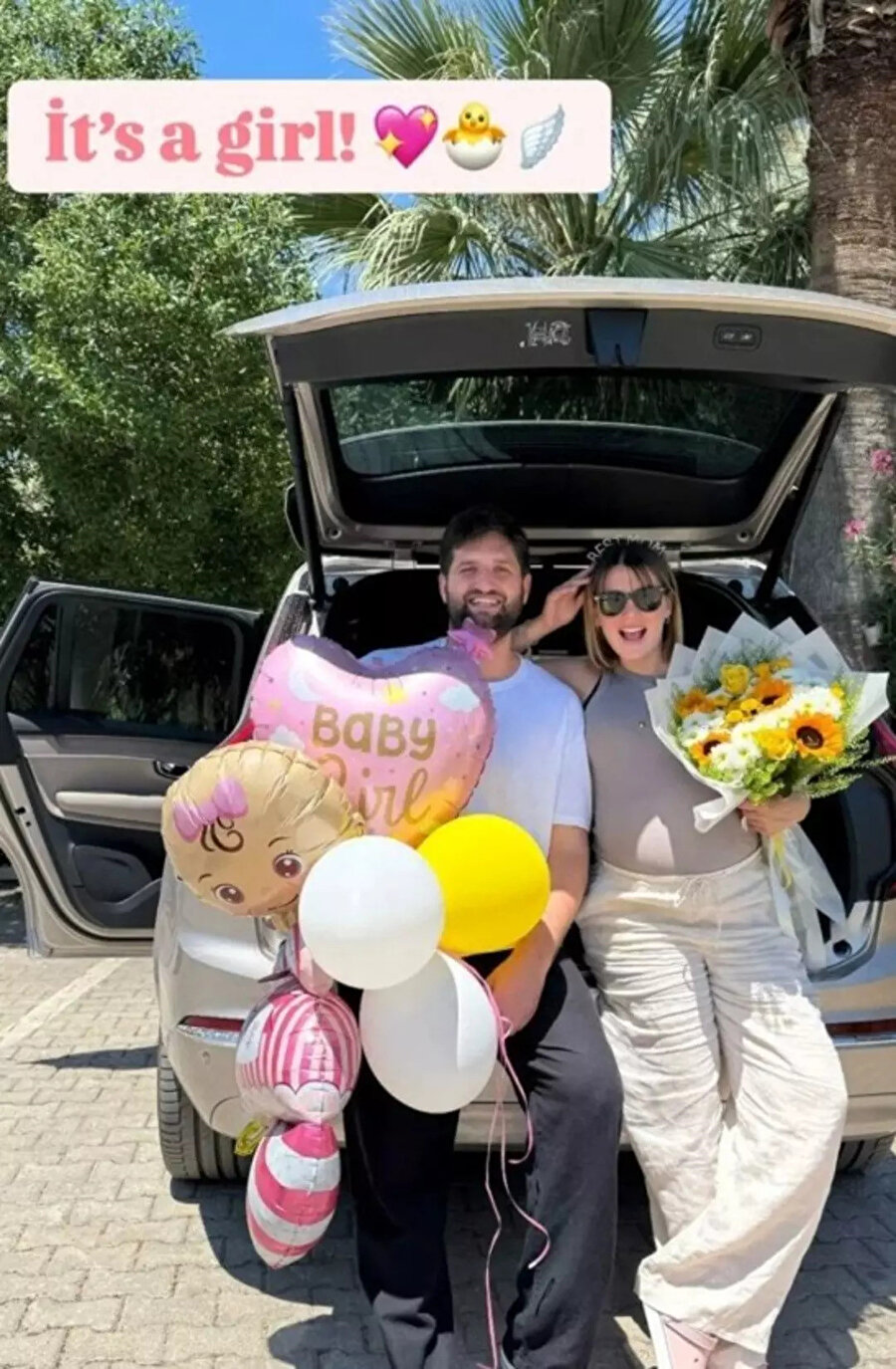 Doğum için gün sayan 32 yaşındaki Karaca, eşiyle verdiği pozda bir kızı olacağını duyurdu.