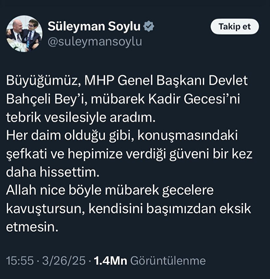 Eski İçişleri Bakanı Süleyman Soylu da Bahçeli'yi Kadir Gecesi vesilesiyle aradığını belirtti. Soylu, "Her daim olduğu gibi, konuşmasındaki şefkati ve hepimize verdiği güveni bir kez daha hissettim." ifadelerini kullandı.