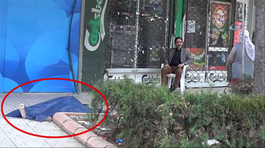 Yerde yatan yaşlı adamın üstü örtülü cenazesine rağmen bazı vatandaşların bankamatikten para çektiği ve cenazenin yanında oturduğu görüntüler dikkat çekti.