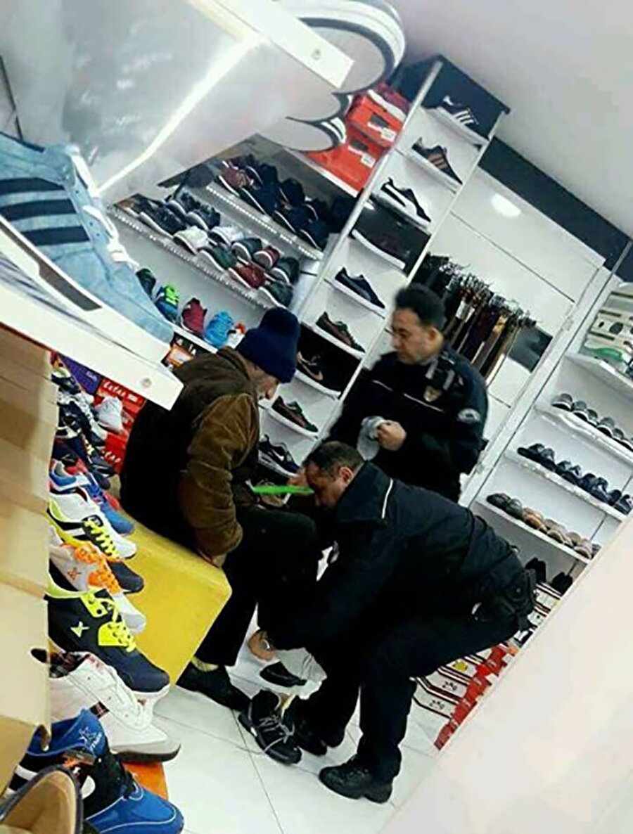 Sosyal medyada bugün paylaşılan bir kare günün çok konuşulanları arasına girdi. Soğuk havada yırtık ayakkabılarıyla sokakta dolaşan yaşlı bir amcayı gören 2 polis, amcayı bir ayakkabı mağazasına götürdü. Yaşlı amcaya yeni bir ayakkabı almak isteyen polisler, amcayı sandalyeye oturtarak eski ayakkabılarını elleriyle çıkardı. Polisler, dükkandan seçtikleri bir ayakkabıyı yine kendi elleriyle amcanın ayağına giydirdi. Yaşlı amcanın çoraplarının ıslak ve yırtık olduğunu gören iş yeri sahibi de, polislerin bu duyarlı davranışından etkilenerek kendisi için aldığı çorapları amcaya verdi. Polisler çorabı da amcanın ayağına giydirdi. Mağazanın sahibi, ayakkabılar için polislerden herhangi bir ücret talep etmedi.
