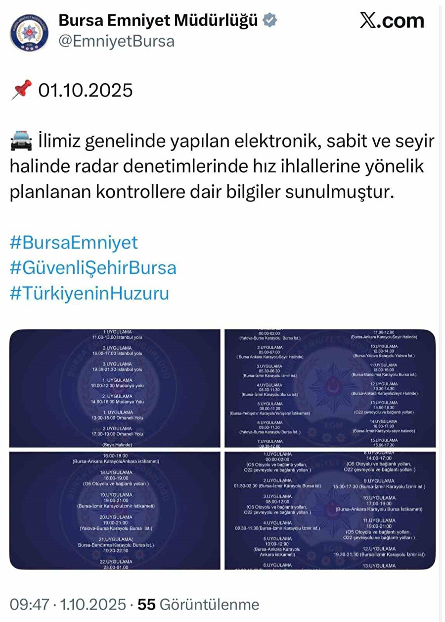 Bursa İl Emniyet Müdürlüğü, il genelinde gerçekleştirilen elektronik, sabit ve seyir halinde yapılan radar denetimlerine ilişkin yeni bir uygulamaya geçti. Buna göre Emniyet Müdürlüğü’nün sosyal medya hesaplarından denetim yapılacak noktalar ve saatleri açıklandı.