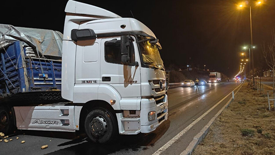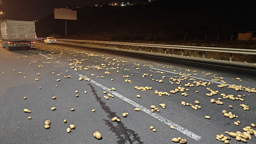 Makaslayan tır yol ortasında kalırken, üzerinde bulunan onlarca kilo patates yola saçıldı. Olayda yaralanan olmazken, polis ekipleri tarafından yol üzerinde güvenlik önlemi alınarak, trafiğin kontrollü şekilde akması sağlandı.