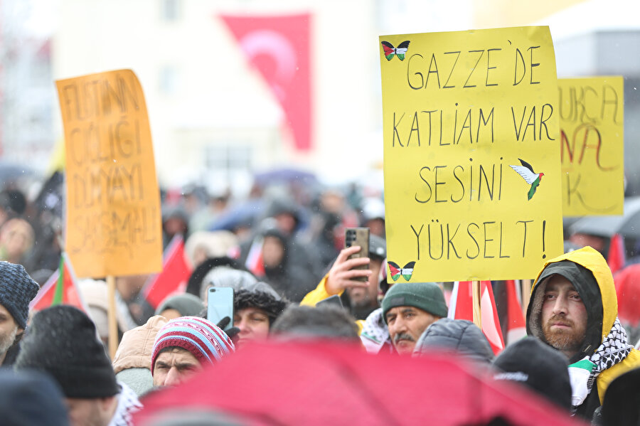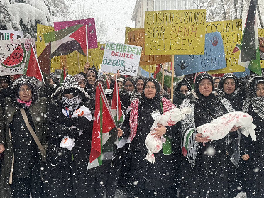 Ardından katılımcılar, ellerinde taşıdıkları Türk ve Filistin bayrakları ile dövizlerle kar altında mitingin düzenleneceği alana yürüdü.