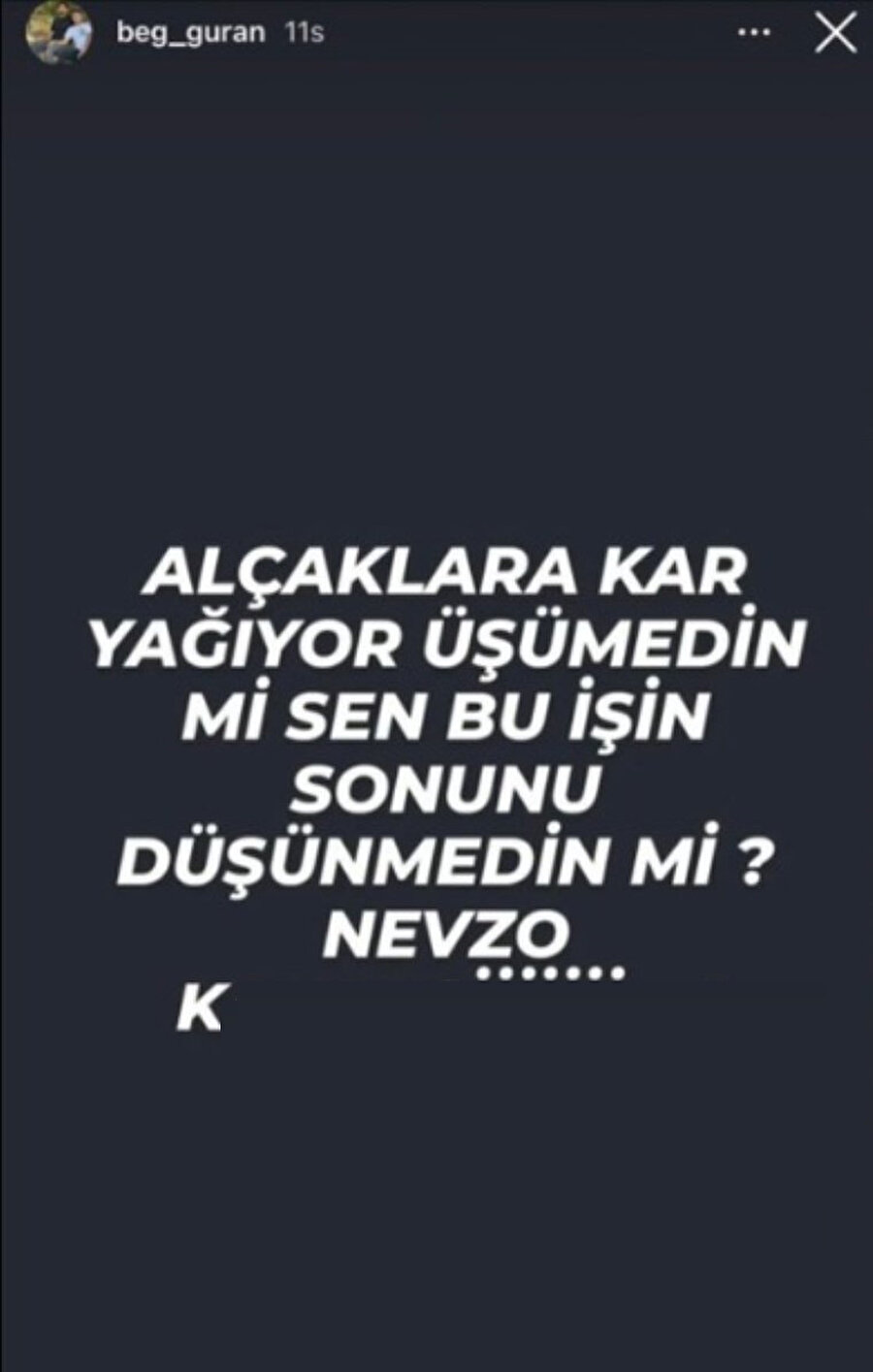 Devran Güran'ın Nevzat Bahtiyar'ı hedef alarak yaptığı paylaşımda "ALÇAKLARA KAR YAĞIYOR ÜŞÜMEDİN Mİ SEN BU İŞİN SONUNU DÜŞÜNMEDİN Mİ ? NEVZO K........!" ifadelerine yer verildi.
