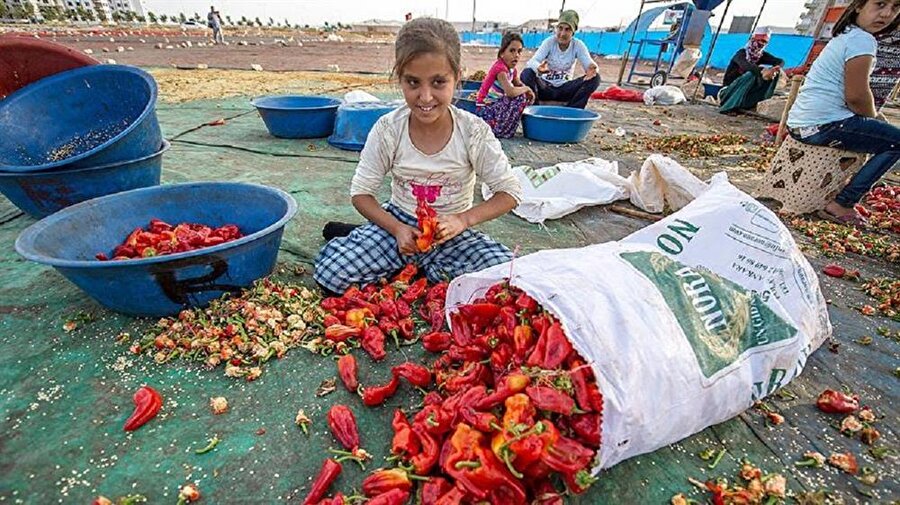 Daha çok kadın ve çocukların çalıştığı alanda biberler, elle parçalandıktan sonra makineden geçirilip naylonların üzerinde bir süre bekletiliyor. Gün içinde yönü değiştirilerek güneşte tamamen kuruması sağlanan biberler, rengi koyulaştıktan sonra makinelerde çekiliyor.