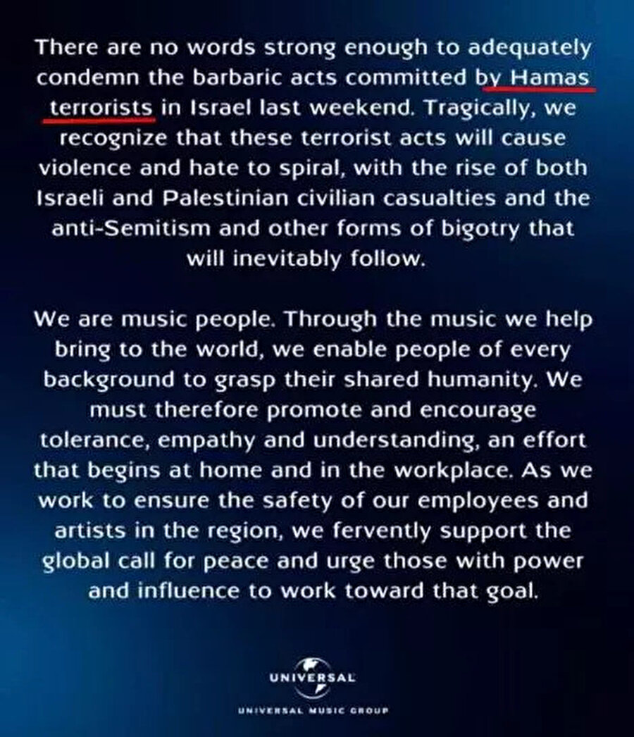 UMG, Siyonist İsrail'in katlimlarını meşrulaştıran, vatanlarını savunan Hamas ve Gazzelilere 'terörist' nitelemesi yapan açıklama yapmıştı.