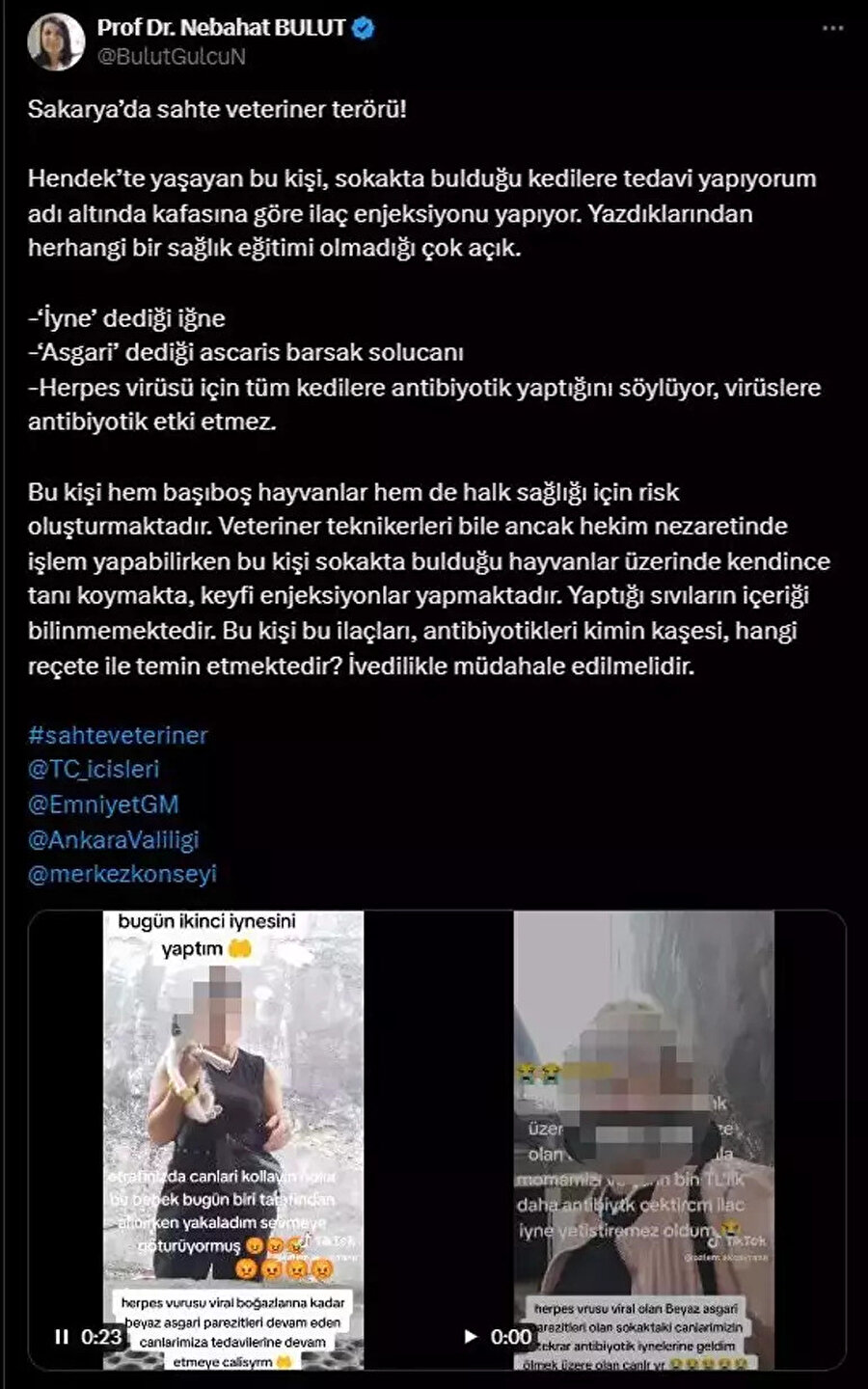 - “Hendek’e yaşayan bu kişi sokakta bulduğu kedilere tedavi yapıyorum adı altında kafasına göre ilaç enjeksiyonu yapıyor. Yazdıklarından herhangi bir eğitim almadığı açık, çok açık. ‘İyne’ dediği ‘iğne’, ‘asgari’ dediği ‘ascaris barsak solucanı’, Herpes virüsü için tüm kedilere antibiyotik yaptığını söylüyor. Virüslere etki etmez. Bu kişi hem başıboş hayvanlar hem de halk sağlığı için risk oluşturmaktadır. Veteriner teknikerleri bile ancak hekim nezaretinde işlem yapabilirken bu kişi sokakta bulduğu hayvanlar üzerinde kendince tanı koymakta, keyfi enjeksiyonlar yapmaktadır. Yaptığı sıvıların içeriği bilinmemektedir. Bu kişi bu ilaçları, antibiyotikleri kimin kaşesi, hangi reçete ile temin etmektedir? İvedilikle müdahale edilmelidir.''
