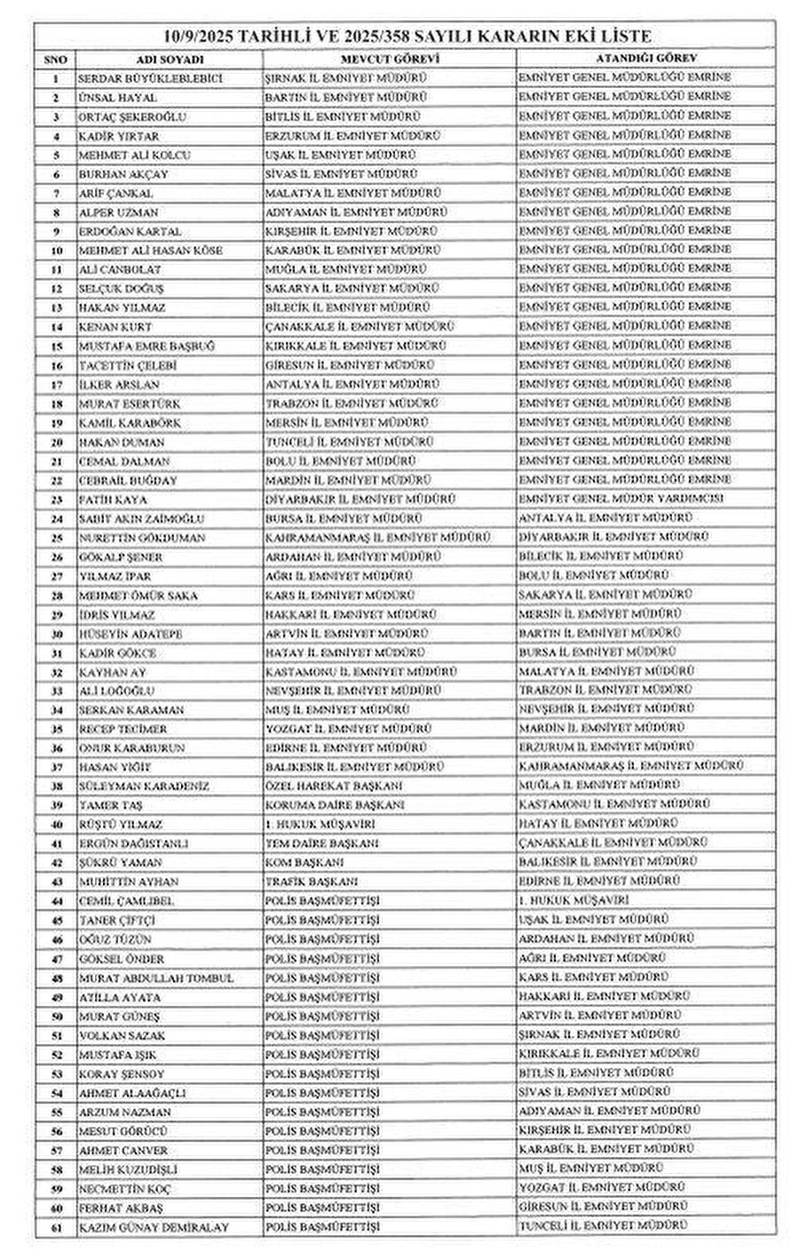 10 Eylül 2025 tarihli ve 2025/358 sayılı Cumhurbaşkanlığı Kararnamesi ile emniyet teşkilatında geniş kapsamlı atamalar yapıldı. Kararnameye göre 37 ilin emniyet müdürü görevden alınarak yeni isimler atandı. Ayrıca bazı polis başmüfettişleri de illerdeki emniyet müdürlüğü görevlerine getirildi.